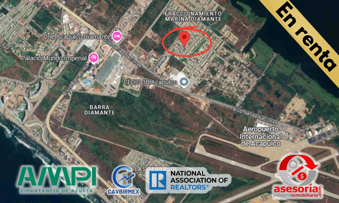 Zona Diamante: A pocos minutos del aeropuerto internacional, laguna de 3 palos y de las mejores playas, centros comerciales de lujo (Mundo Imperial), supermercados (Chedraui Selecto Diamante, OXXO), hospitales (CRIT Guerrero) y transporte público.